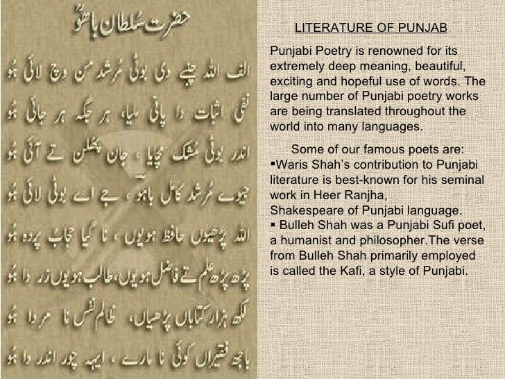 - 11. <ul><li>LITERATURE OF PUNJAB </li></ul><ul><li>Punjabi Poetry is renowned for its extremely deep meaning, beautiful, exciting and hopeful use of words. The large number of Punjabi poetry works are being translated throughout the world into many languages. </li></ul><ul><li>Some of our famous poets are: </li></ul><ul><li>Waris Shah’s contribution to Punjabi literature is best-known for his seminal work in Heer Ranjha, </li></ul><ul><li>Shakespeare of Punjabi language. </li></ul><ul><li>Bulleh Shah was a Punjabi Sufi poet, a humanist and philosopher.The verse from Bulleh Shah primarily employed is called the Kafi, a style of Punjabi. </li></ul>