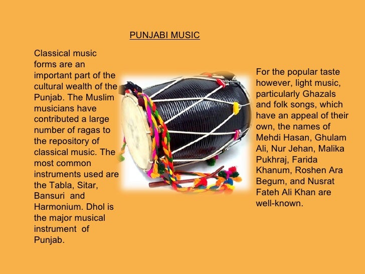 - 15. PUNJABI MUSIC Classical music forms are an important part of the cultural wealth of the Punjab. The Muslim musicians have contributed a large number of ragas to the repository of classical music. The most common instruments used are the Tabla, Sitar, Bansuri and Harmonium. Dhol is the major musical instrument of Punjab. For the popular taste however, light music, particularly Ghazals and folk songs, which have an appeal of their own, the names of Mehdi Hasan, Ghulam Ali, Nur Jehan, Malika Pukhraj, Farida Khanum, Roshen Ara Begum, and Nusrat Fateh Ali Khan are well-known.