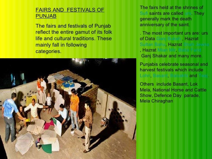 - 16. FAIRS AND FESTIVALS OF PUNJAB The fairs and festivals of Punjab reflect the entire gamut of its folk life and cultural traditions. These mainly fall in following categories. The fairs held at the shrines of Sufi saints are called urs . They generally mark the death anniversary of the saint. . The most important urs are: urs of Data Ganj Buksh , Hazrat Sultan Bahu , Hazrat Shah Jewna , Hazrat Mian Mir , Baba Farid Ganj Shakar and many more. Punjabis celebrate seasonal and harvest festivals which include Lohri , Basant , Baisakhi and Teej . Others include Basant, Lok Mela, National Horse and Cattle Show, Defence Day parade, Mela Chiraghan
