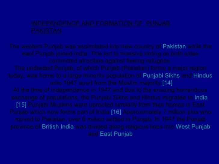 - 3. The western Punjab was assimilated into new country of Pakistan while the east Punjab joined India. This led to massive rioting as both sides committed atrocities against fleeing refugees. The undivided Punjab, of which Punjab (Pakistan) forms a major region today, was home to a large minority population of Punjabi Sikhs and Hindus unto 1947 apart from the Muslim majority. [14] At the time of independence in 1947 and due to the ensuing horrendous exchange of populations, the Punjabi Sikhs and Hindus migrated to India . [15] Punjabi Muslims were uprooted similarly from their homes in East Punjab which now forms part of India. [16] Approximately 7 million plus who moved to Pakistan, over 6 million settled in Punjab. In 1947 the Punjab province of British India was divided along religious lines into West Punjab and East Punjab . INDEPENDENCE AND FORMATION OF PUNJAB PAKISTAN