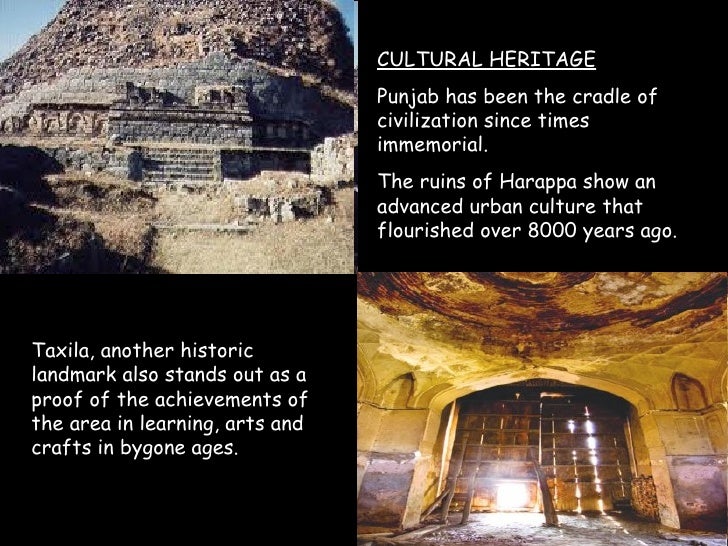 - 4. CULTURAL HERITAGE Punjab has been the cradle of civilization since times immemorial. The ruins of Harappa show an advanced urban culture that flourished over 8000 years ago. Taxila, another historic landmark also stands out as a proof of the achievements of the area in learning, arts and crafts in bygone ages.