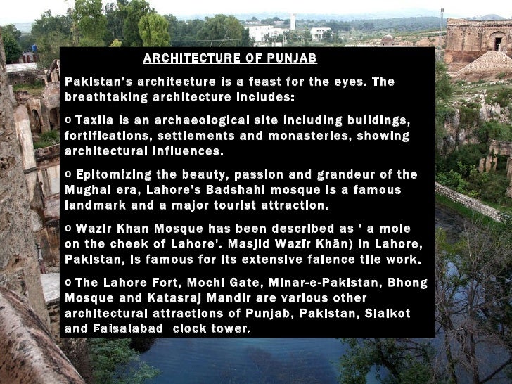 - 6. <ul><li>ARCHITECTURE OF PUNJAB </li></ul><ul><li>Pakistan’s architecture is a feast for the eyes. The breathtaking architecture includes: </li></ul><ul><li>Taxila is an archaeological site including buildings, fortifications, settlements and monasteries, showing architectural influences. </li></ul><ul><li>Epitomizing the beauty, passion and grandeur of the Mughal era, Lahore's Badshahi mosque is a famous landmark and a major tourist attraction. </li></ul><ul><li>Wazir Khan Mosque has been described as ' a mole on the cheek of Lahore'. Masjid Wazīr Khān) in Lahore, Pakistan, is famous for its extensive faience tile work. </li></ul><ul><li>The Lahore Fort, Mochi Gate, Minar-e-Pakistan, Bhong Mosque and Katasraj Mandir are various other architectural attractions of Punjab, Pakistan, Sialkot and Faisalabad clock tower. </li></ul>