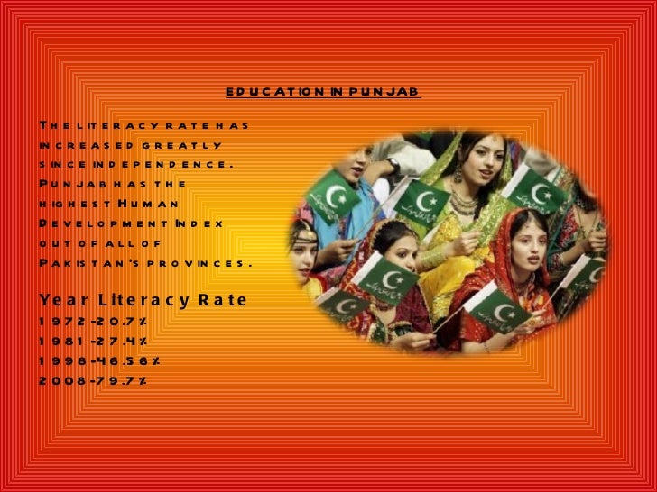 - 7. EDUCATION IN PUNJAB The literacy rate has increased greatly since independence. Punjab has the highest Human Development Index out of all of Pakistan's provinces. Year Literacy Rate 1972 - 20.7% 1981 - 27.4% 1998 - 46.56% 2008 - 79.7%