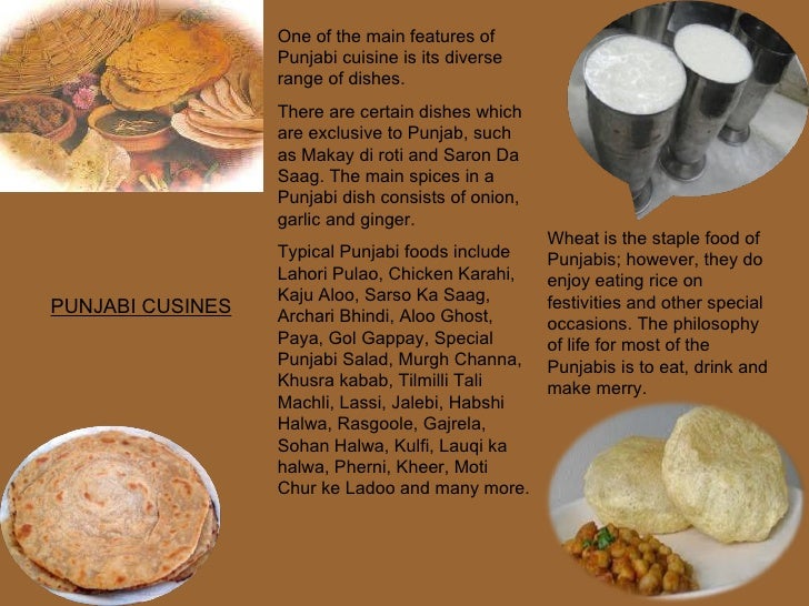 - 9. PUNJABI CUSINES One of the main features of Punjabi cuisine is its diverse range of dishes. There are certain dishes which are exclusive to Punjab, such as Makay di roti and Saron Da Saag. The main spices in a Punjabi dish consists of onion, garlic and ginger. Typical Punjabi foods include Lahori Pulao, Chicken Karahi, Kaju Aloo, Sarso Ka Saag, Archari Bhindi, Aloo Ghost, Paya, Gol Gappay, Special Punjabi Salad, Murgh Channa, Khusra kabab, Tilmilli Tali Machli, Lassi, Jalebi, Habshi Halwa, Rasgoole, Gajrela, Sohan Halwa, Kulfi, Lauqi ka halwa, Pherni, Kheer, Moti Chur ke Ladoo and many more. Wheat is the staple food of Punjabis; however, they do enjoy eating rice on festivities and other special occasions. The philosophy of life for most of the Punjabis is to eat, drink and make merry.